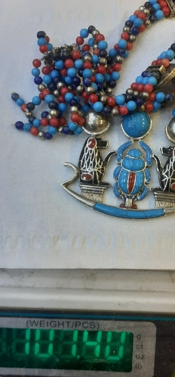Necklace with multicolour Amulet, big pendant, Egypt, Scarab, Djehuti Toth Monkeys, Sterling Silver 925