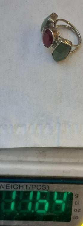 Ring from 2 green Jade and 1 Ruby Gemstones, sitting: Sterling Silver 925.